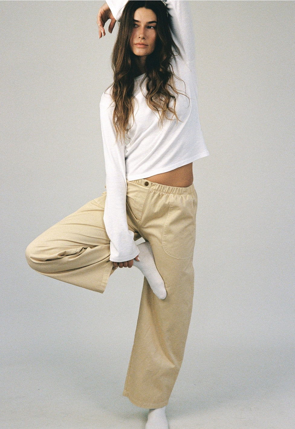 Inspired by the chinos in 90's catalogues, these ankle length twill pants feature a snap front elasticated waistband and straight unstructured leg. The medium weight twill has been garment dyed for a soft, broken-in finish.