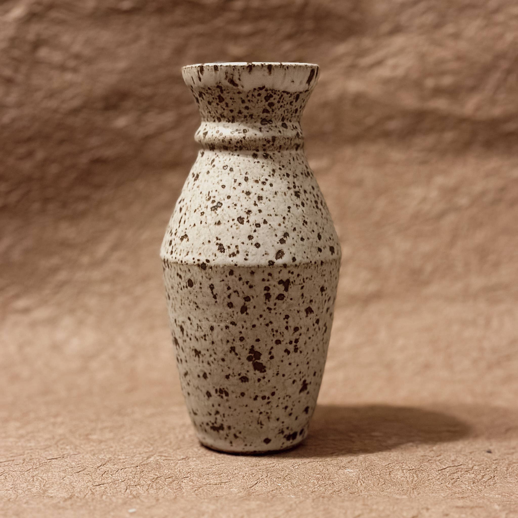 This high-fire stoneware bud vase features soft curves and a matte speckled Cornwall glaze. Each piece is unique, adding a tranquil, organic touch to any space.