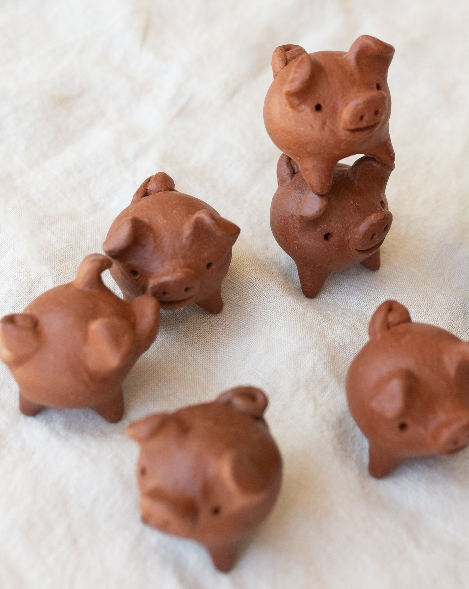 These little terracotta pigs are made with clay dug from the mountainside near the village of Pomaire, Chile. This clay is traditionally used to create earthenware cookware used over an open fire, but in this instance it is transformed into a “chanchito” a little three-legged pig.