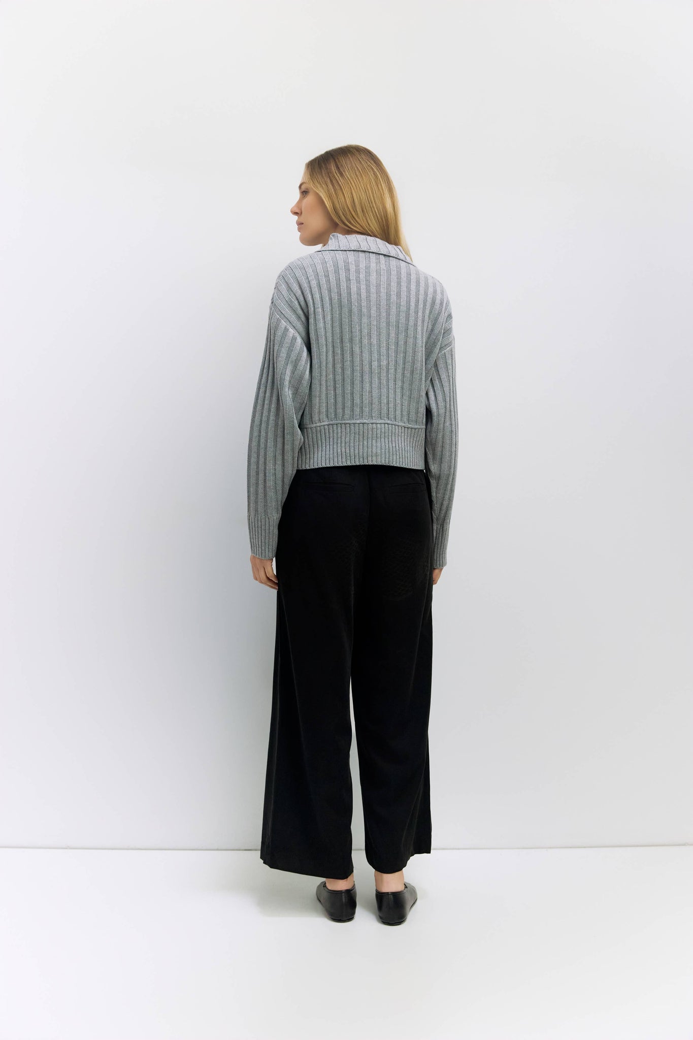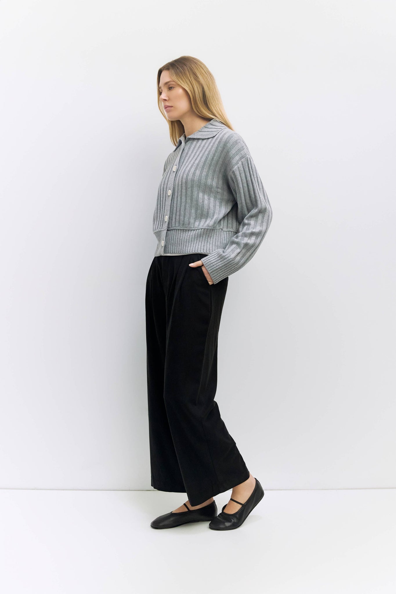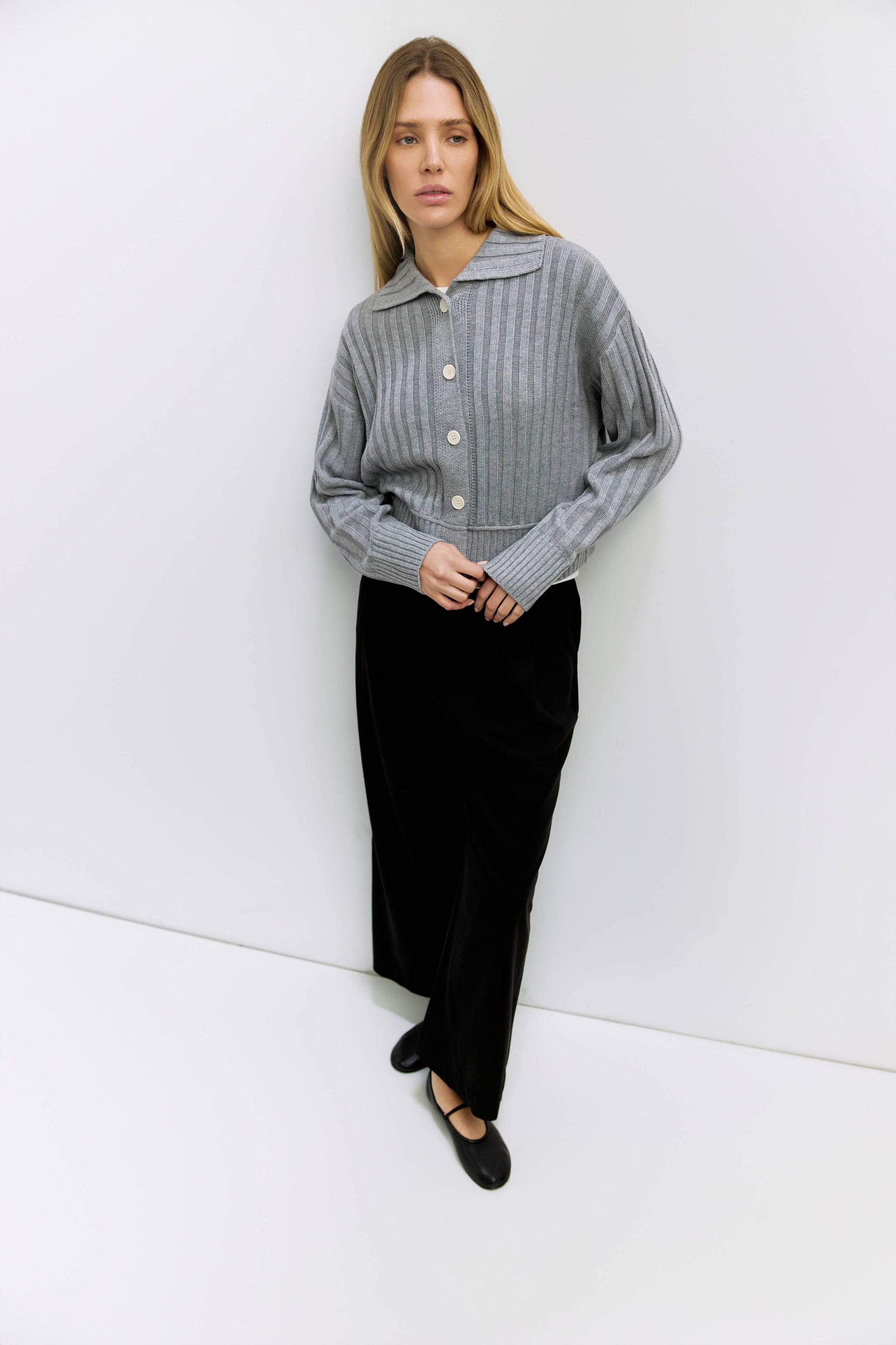 The Joni Cardigan is knitted from a heavyweight, thick-ribbed fabrication that offers structure and warmth.