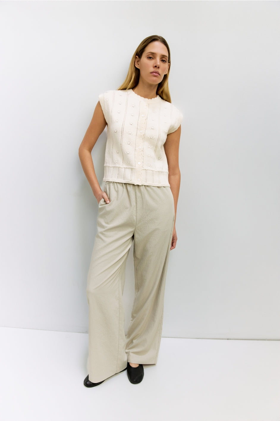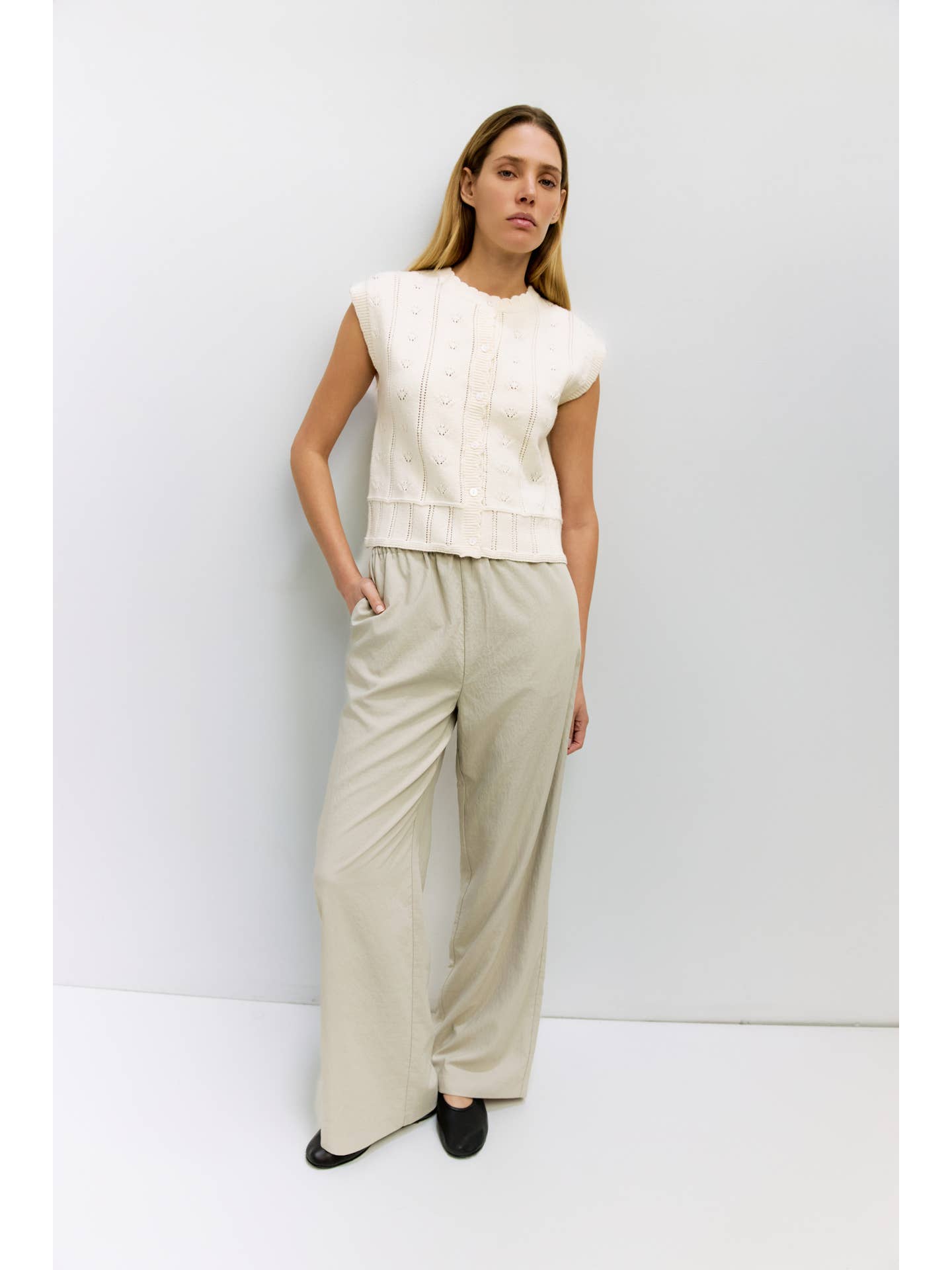 The Linda Vest is crafted from heavyweight pointelle knit with a relaxed fit, featuring a sleeveless silhouette, scalloped crewneck, and full front button closure with scallop edging for a soft, textured finish.