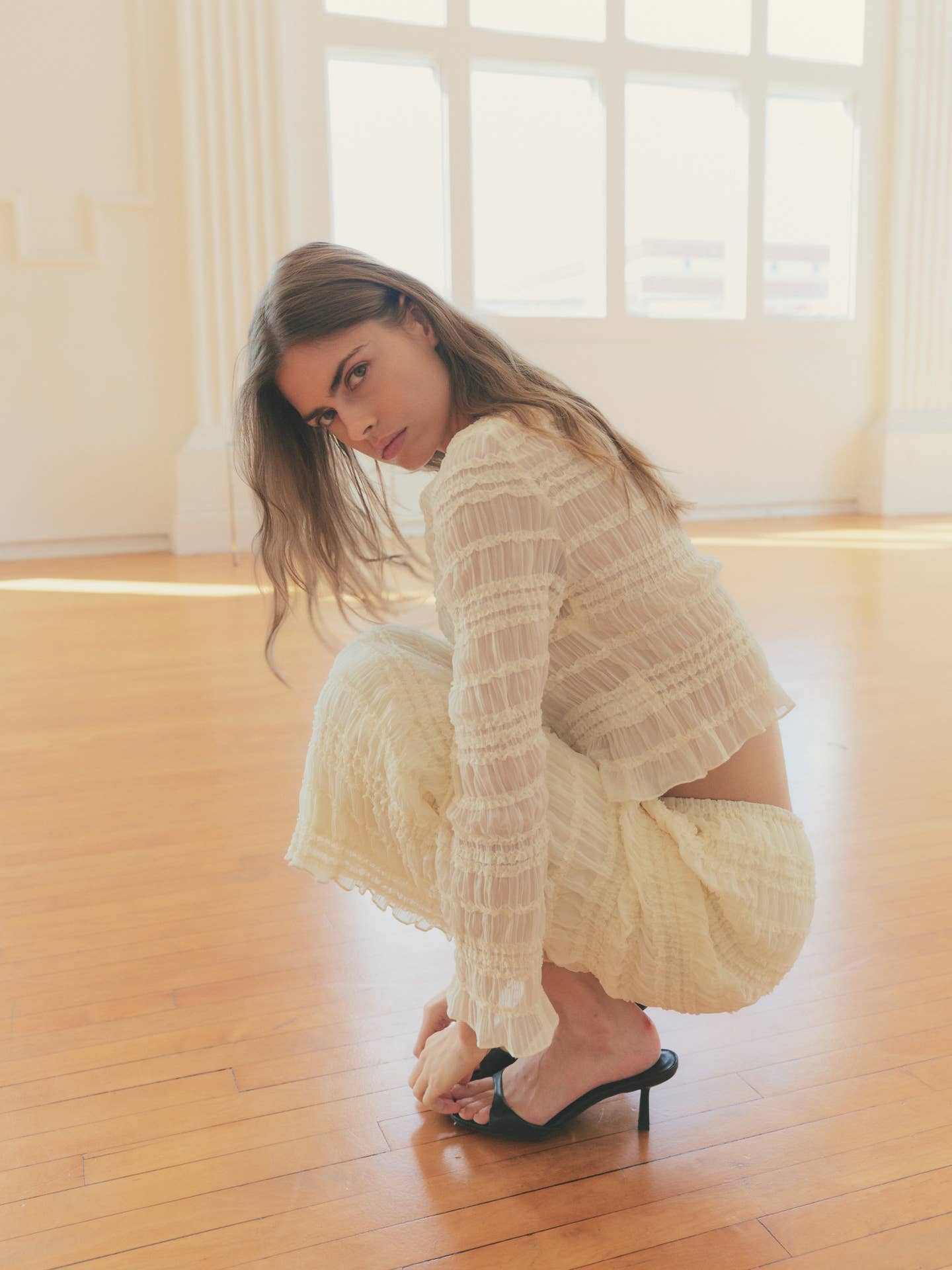 The Mindy Top is crafted from smocked, textured sheer crepe with a relaxed silhouette and long sleeves for a lightweight, airy feel.