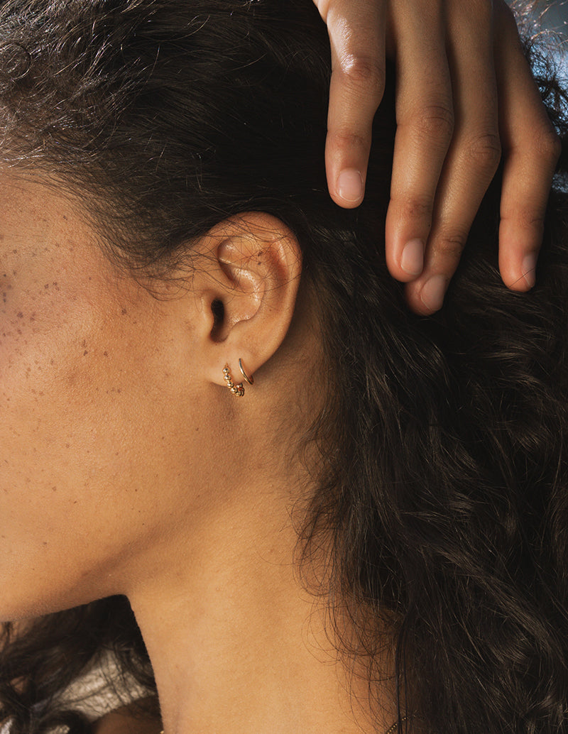 A playful twist on a Baleen favorite. The Bubble Nautilus Hoop reimagines our signature Nautilus Hoop with a beaded wire that adds texture and shine. Just like the original, this clever design threads through the ear to create the illusion of a double hoop β but with a bubbly new personality. Lightweight, unique, and endlessly versatile, itβs the perfect balance of modern edge and subtle fun.