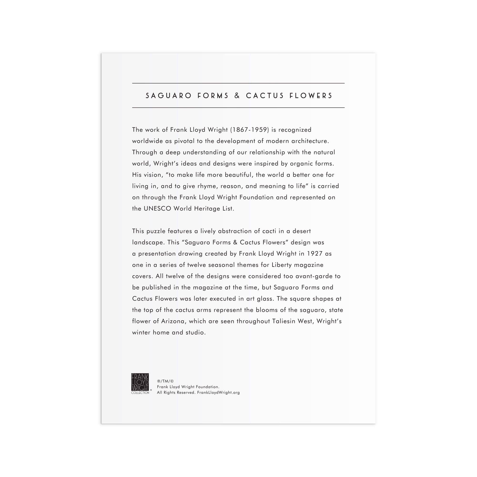 Experience architectural brilliance with this 750-piece shaped foil puzzle featuring Frank Lloyd Wright’s iconic Saguaro Cactus & Forms design. Merging organic desert imagery with geometric abstraction, the reflective foil accents add depth and visual sophistication to each piece.