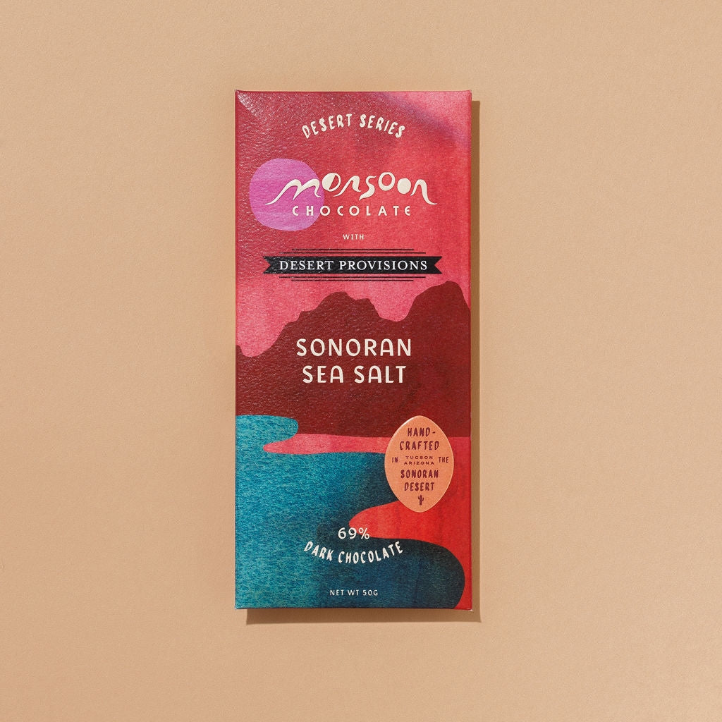 Monsoon Chocolate, an award-winning chocolate maker based in Tucson, Arizona, creates this bar with unrefined, solar-dried sea salt harvested from a remote estuary where the Sonoran Desert meets the Sea of Cortez. Rich in minerals and trace elements, the salt adds a distinctive depth of flavor and a satisfying crunch, perfectly complementing the smooth, bold notes of 74% dark chocolate. Each bite reflects the desert’s unique terroir.