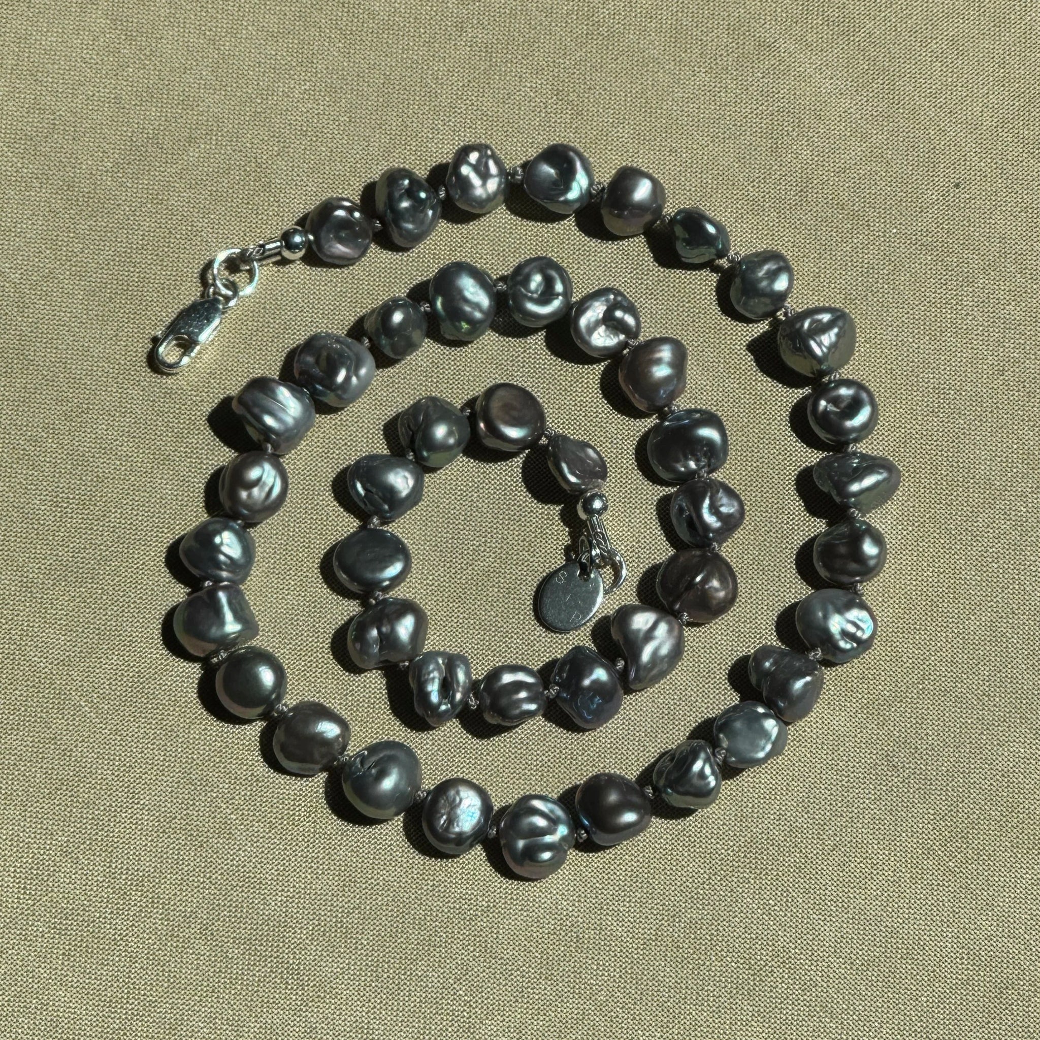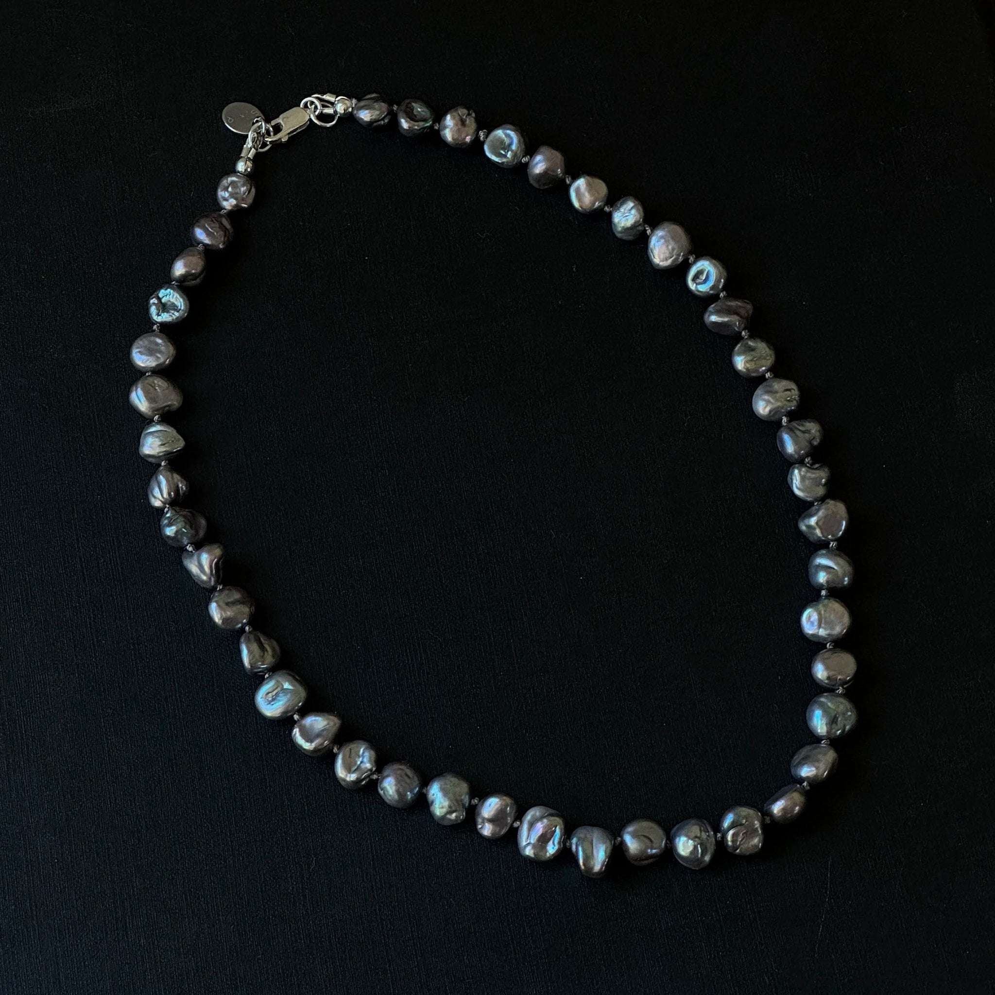 Materials: 6-8mm freshwater pearl beads. Hand strung and knotted on grey silk cord with sterling silver hardware.