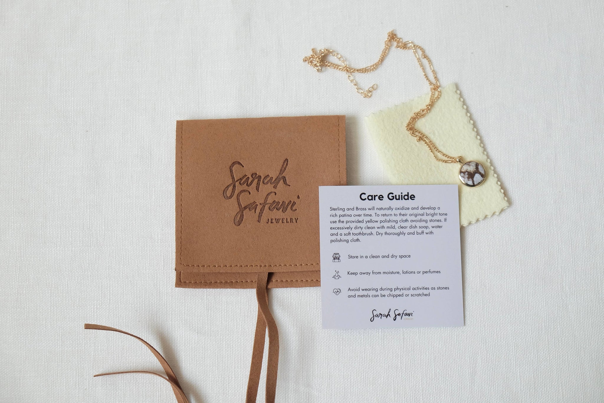 All pieces now come with a keepsake bag, a care card and polishing cloth. Every stone in these necklaces is cut by me. They are personally sourced from small rock shops, collectors and directly from family owned mines. I love to research and look for rocks that come from the western part of the US and Mexico. Each necklace has the name and location of the rock used written on the tag.