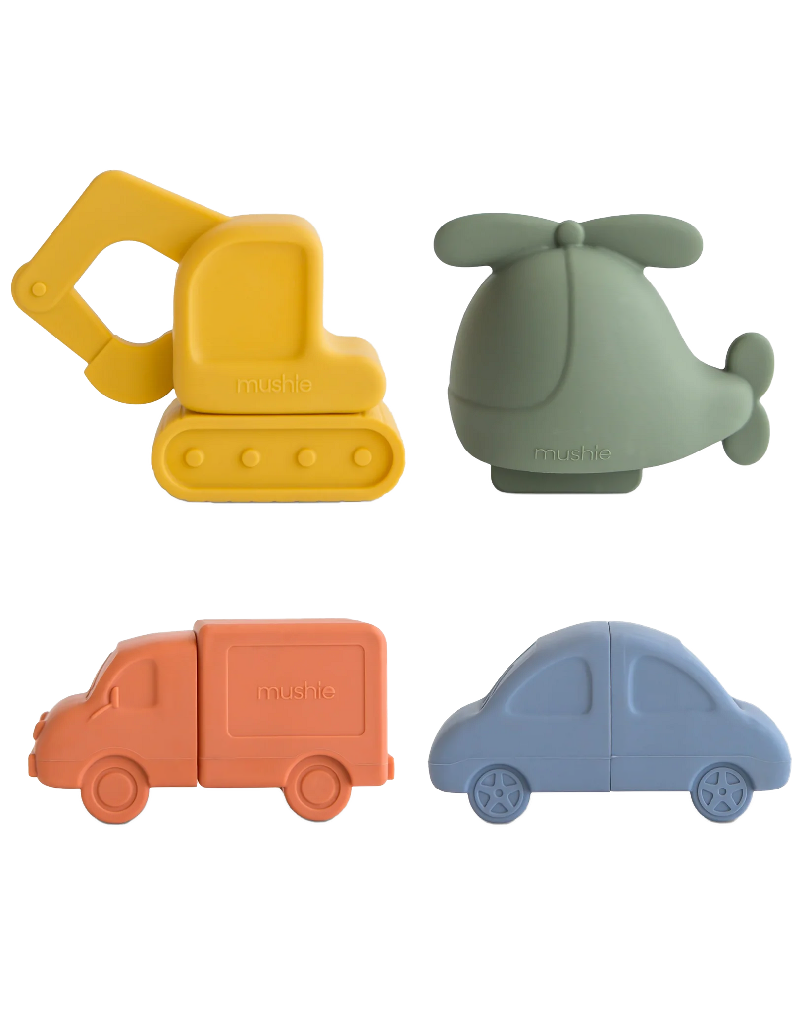 What’s Included: 1 Set of 4x Silicone VehiclesLet your child’s imagination travel far and wide with the vehicles bath play set that includes a helicopter, car, truck and excavator. Made from 100% food grade silicone, the soft material is easy for little hands to hold while wet or dry. Its inventive design allows each toy to open into two separate pieces for thorough cleaning and fast drying. This feature allows the toys to remain mold-free with its easy-to-clean pieces that are dishwasher safe. After each use, we recommend opening the pieces to rinse out and air dry before storing.