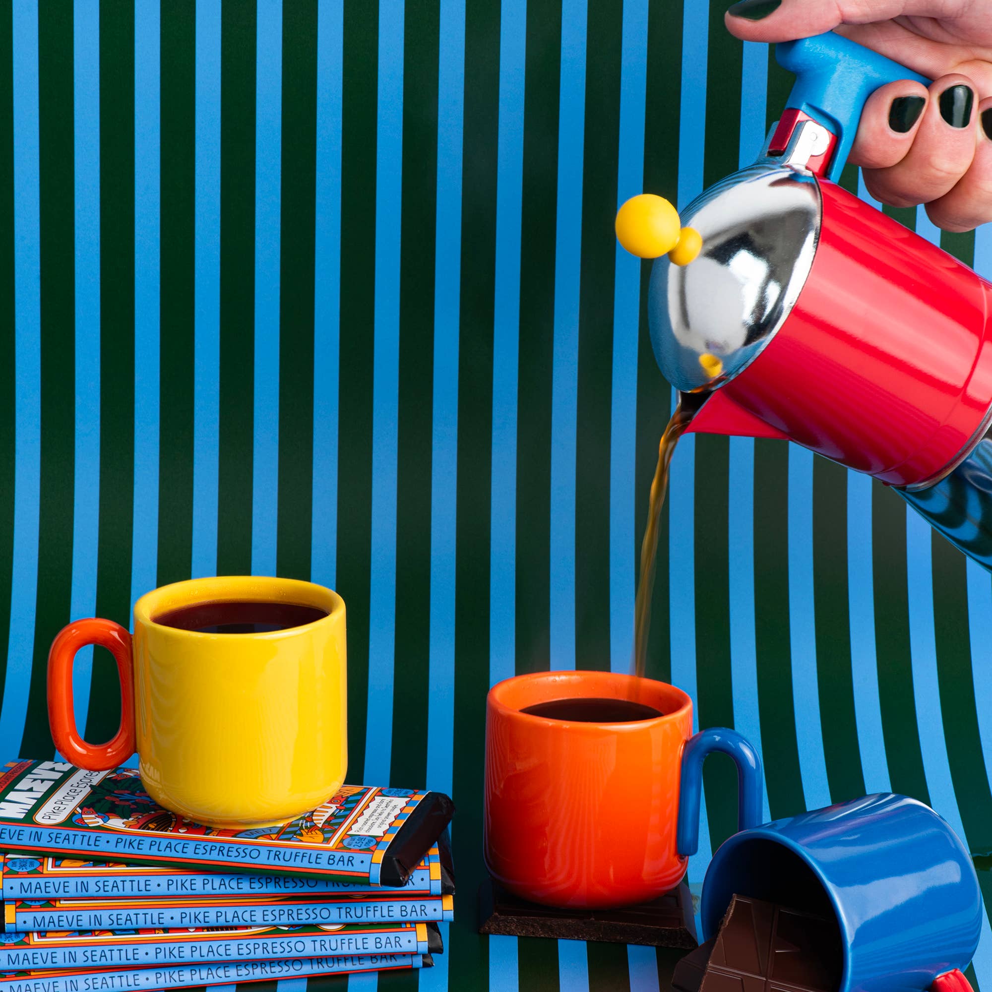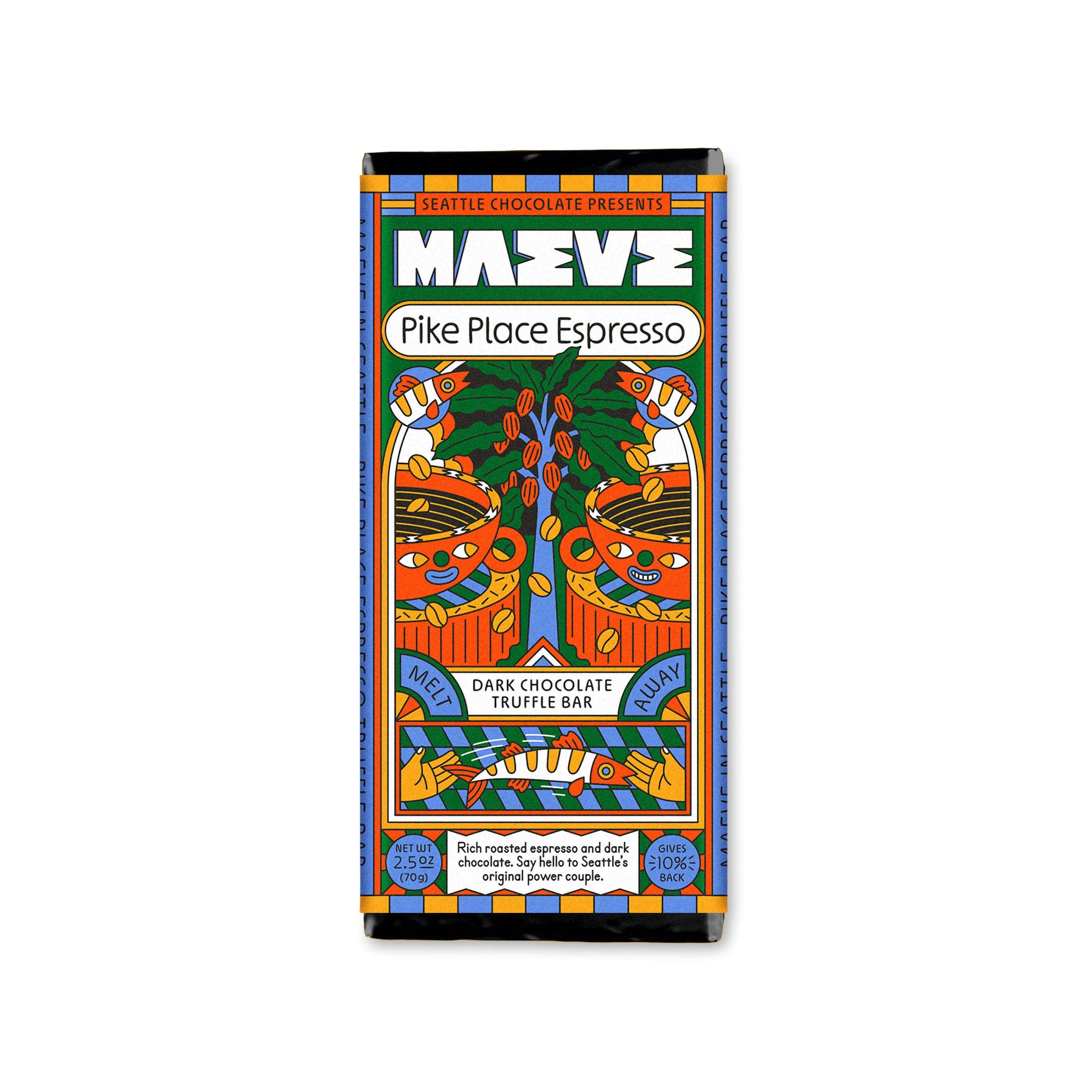 Seattle’s original power couple—dark chocolate and espresso—come together in this Maeve classic. A rich dark chocolate shell envelops a creamy truffle center infused with bold decaffeinated espresso, roasted less than 2 miles from Maeve’s factory. It’s a deep, velvety bite that’s as smooth as a perfectly pulled shot.