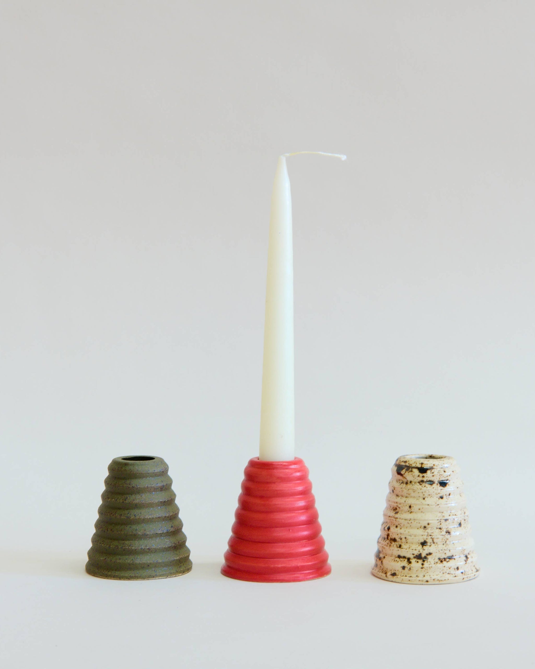 Thrown and shaped into a screw- like pattern, this modern taper holder adds an eye-catching silhouette to your mantel or tablespace. Can also double as a cute bud vase for flowers!