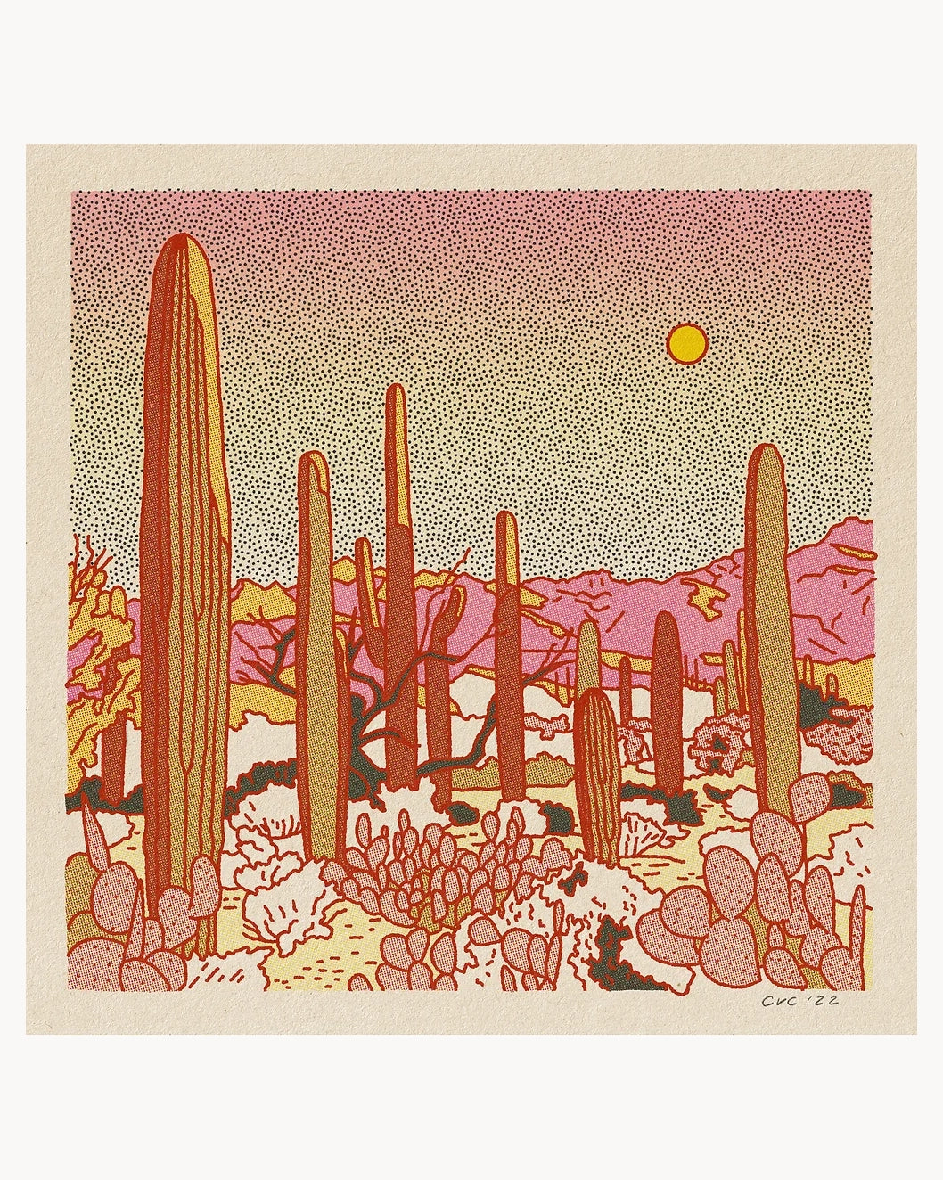 Desert Mountain 12"x 12" printed on 100% recycled 100#C French paper. The paper is a pulpy white texture with some color and paper texture printed on it.