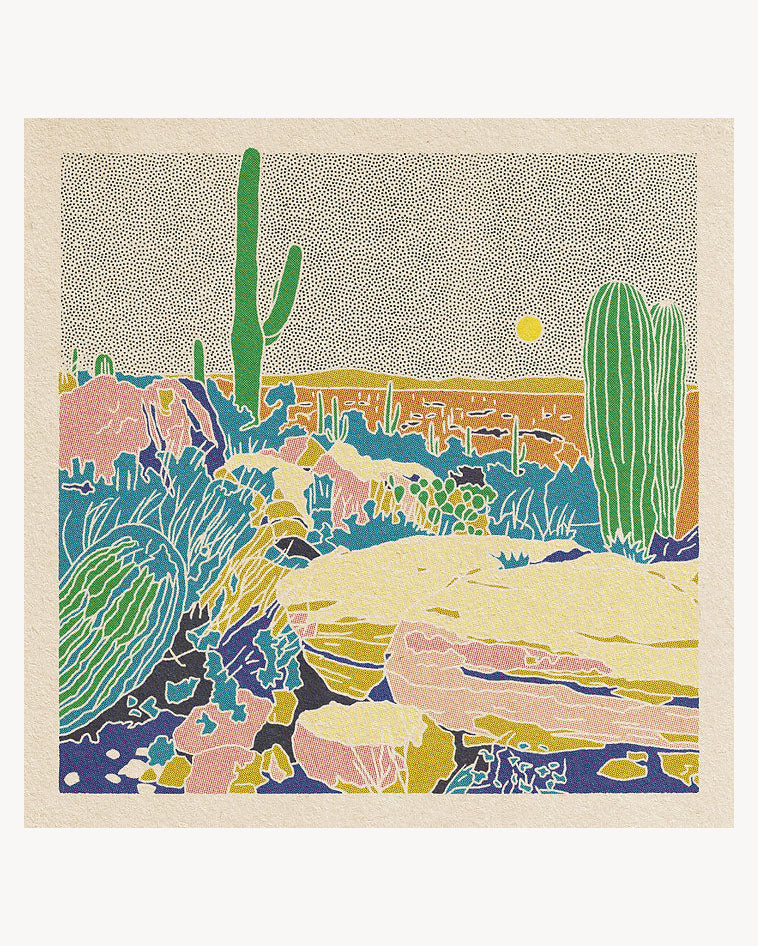 Desert Mountain 12"x 12" printed on 100% recycled 100#C French paper. The paper is a pulpy white texture with some color and paper texture printed on it.