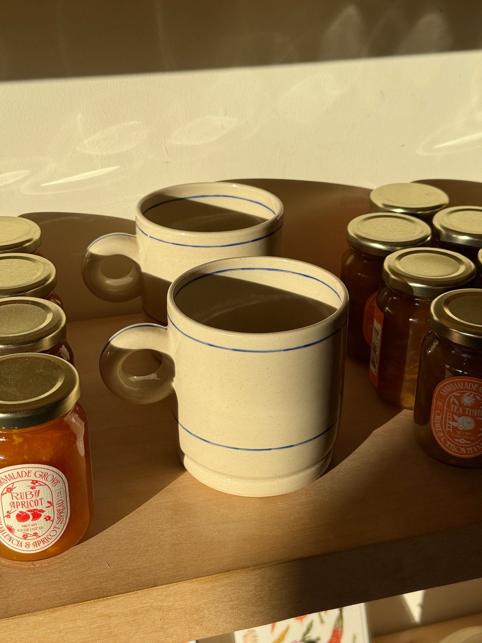 Hand thrown mug with a hand painted stripe detail.
