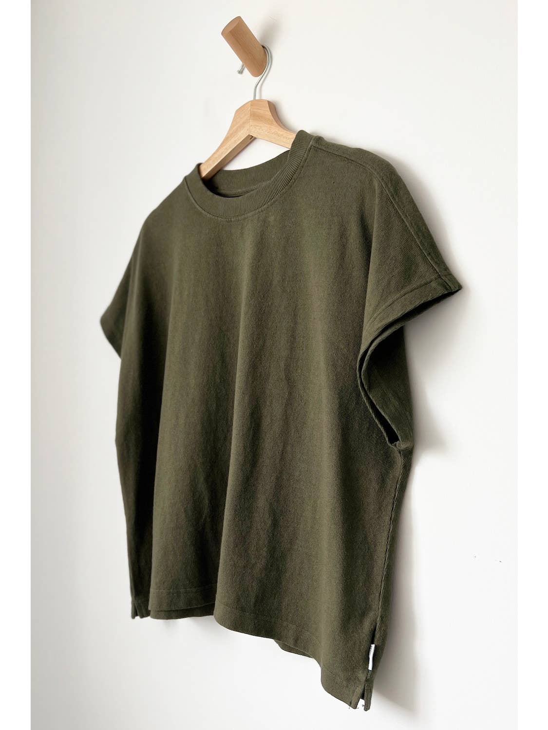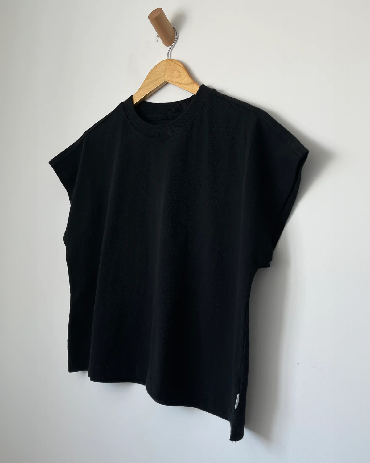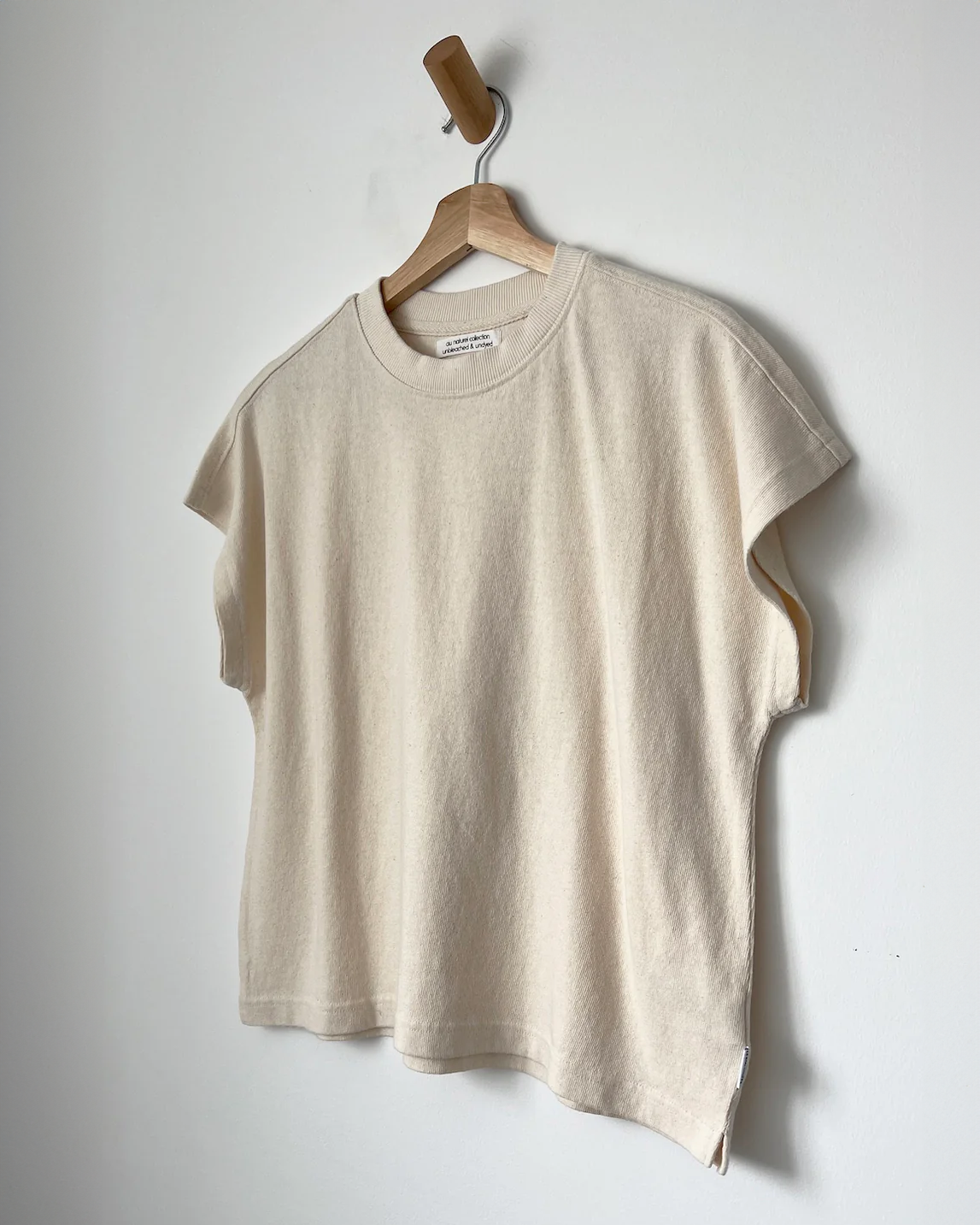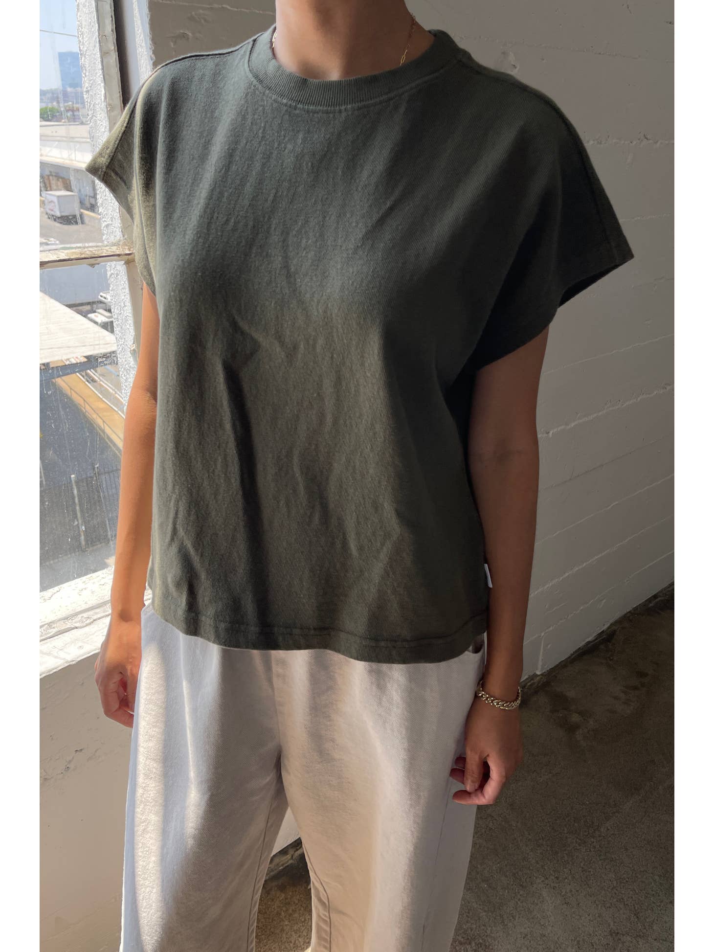 The Jeanne tee is the perfect muscle tee. Featuring a slightly shorter length that pairs beautifully with high-waisted bottoms, it still provides enough coverage for mid-rise styles. The subtle off-shoulder dolman sleeve adds just the right touch of relaxed charm. Finished with a high crew neck and an extra-wide neckband, she delivers a signature, effortlessly stylish look.