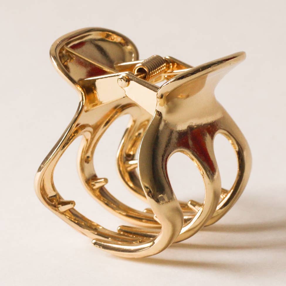 This hair claw clip features a long organic shape with metal for a natural and minimal look. Each clip is carefully crafted for a polished and refined finish. It securely grips hair with its spring-loaded mechanism and sturdy teeth to prevent hair damage.