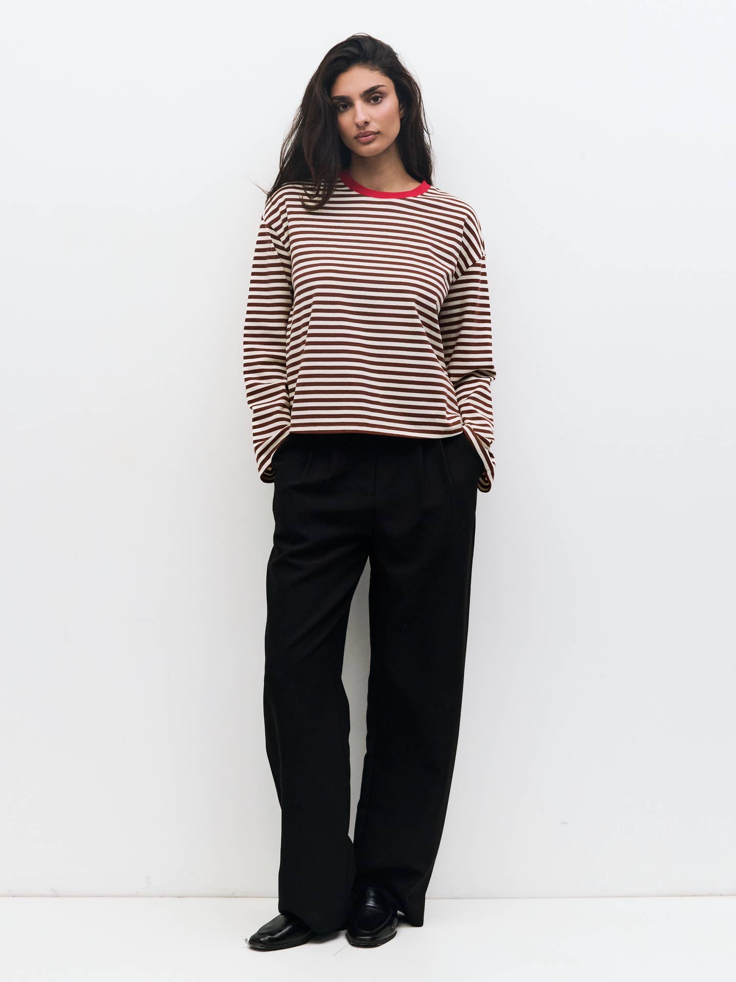The Callahan Top is a relaxed-fit long-sleeved tee made from midweight striped fabric. It features a solid color crewneck and drop shoulders for a casual, comfortable look. A versatile essential for layering or wearing on its own.